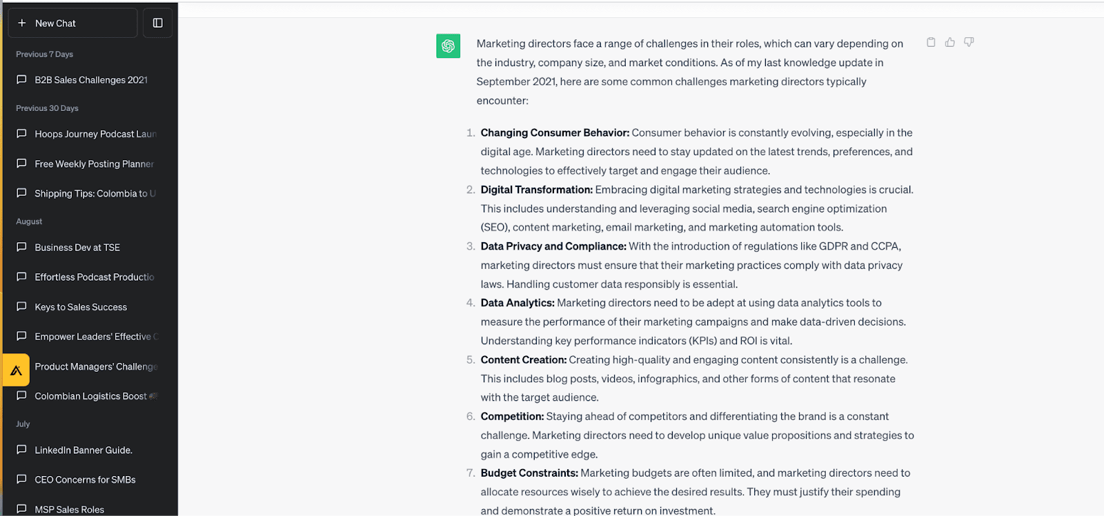 Kelly recommended using AI-driven chat tools, like ChatGPT, to gather insights into prospects' pain points and challenges. These insights help students and sales professionals craft more relevant and impactful sales messages.