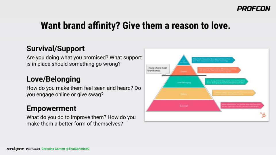 Christina Garnett, advocacy strategist and principal marketing manager at HubSpot, created a guide for customer affinity in her Marketing ProfCon 2023 session, “Fostering Brand Love: Driving Customer Affinity in the Age of Noise and Automation.” Read on to learn how to create exceptional customer experiences and measure the impact while proving the return on investment (ROI) of brand love.