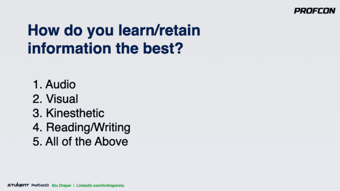 Stu's speech centered on the concept of effective pedagogy. He emphasized the need for a multimodal approach to cater to diverse learning preferences. Stu presented five options: audio, visual, kinesthetic, reading and writing, and a combination of the above.