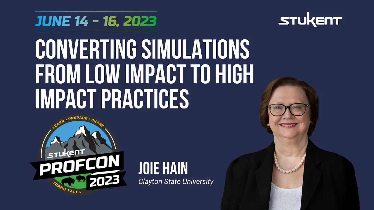 In this session, Joie Hain will discuss how to convert a simulation into a High Impact Practice. High Impact Practices increase student engagement, which results in more robust learning and better student retention. Hain will present High Impact Practice definitions and examples of ways to implement them with simulations.