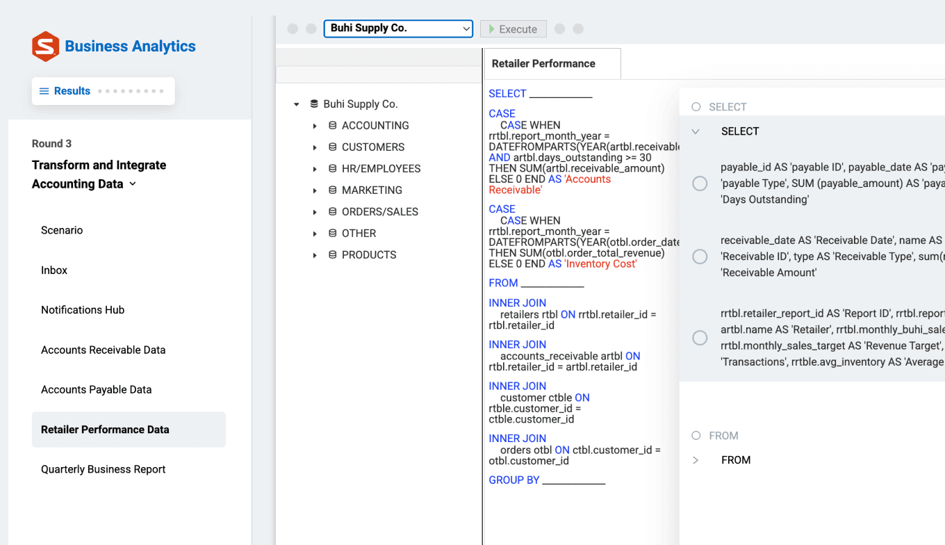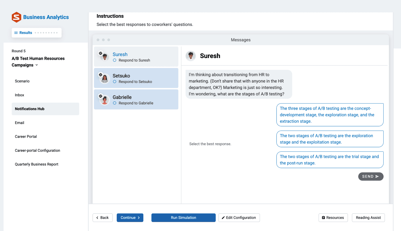 Discover how each round enhances your students' analytical abilities. Want to know more about how the Business Analytics Simternship functions? Walk through a round to see it in action.