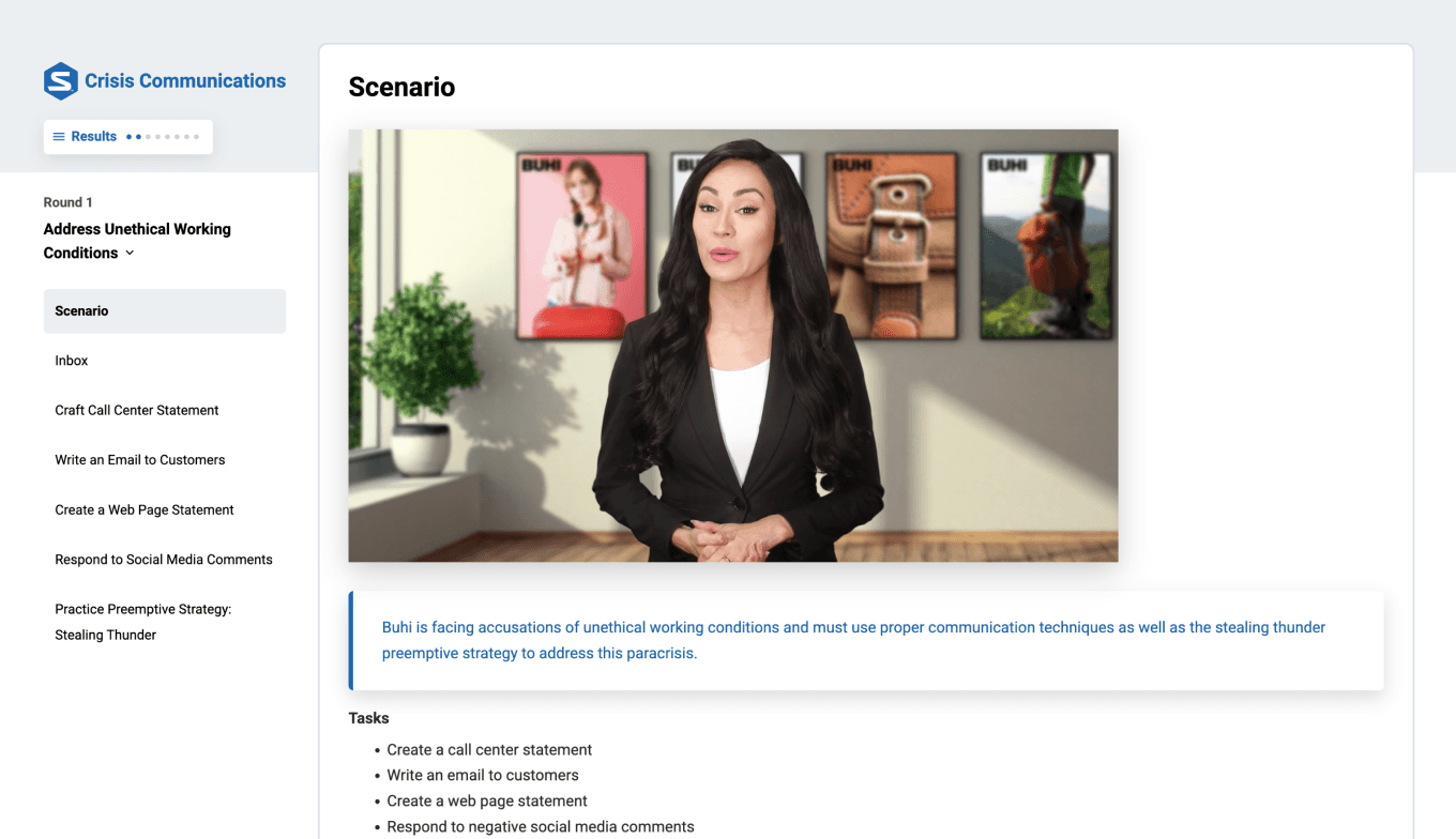 Each round asks students to apply what they’ve learned to real-world crisis communication scenarios. Curious to see how the Simternship works? Take a guided tour of a round!