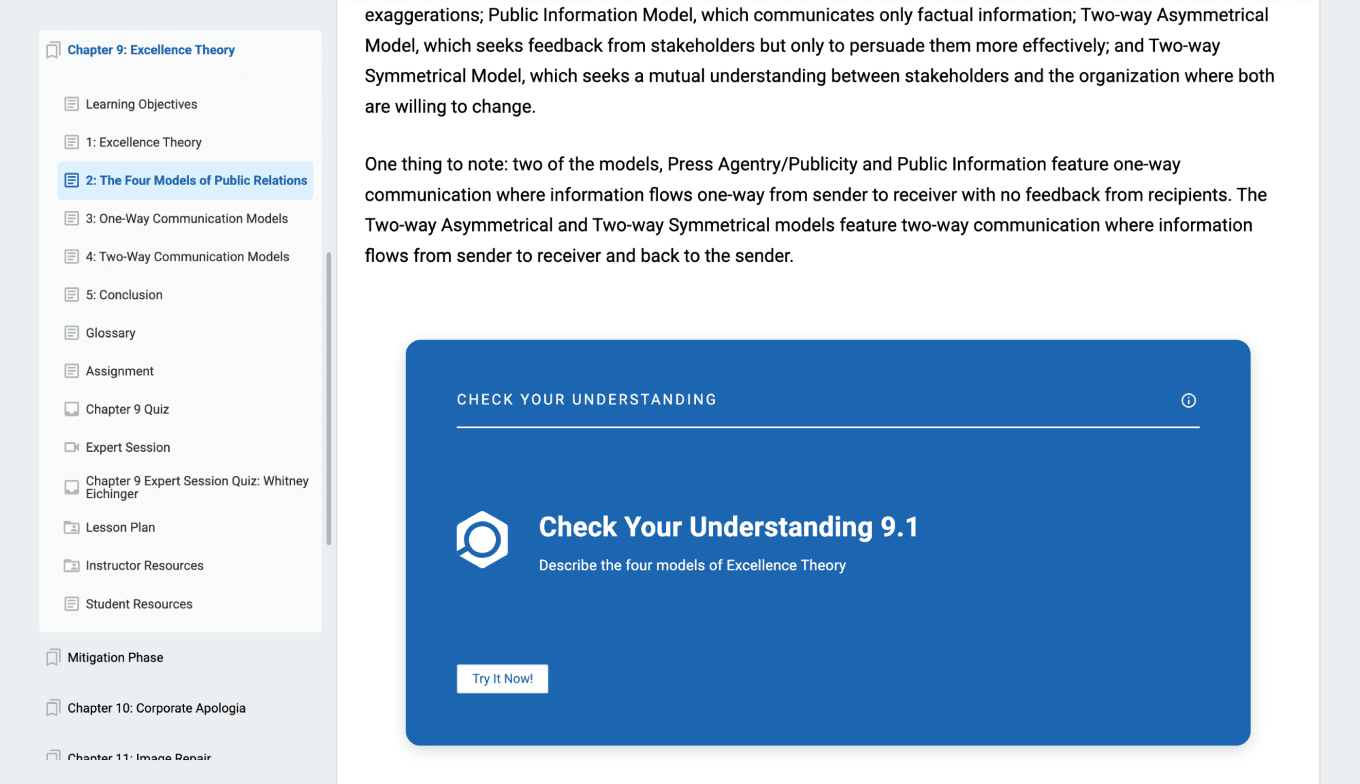 The “Crisis Communication” courseware contains robust instructional resources for educators and students. Best of all, the Stukent team updates the courseware annually, which means your curriculum will always be on the cutting edge of your industry.