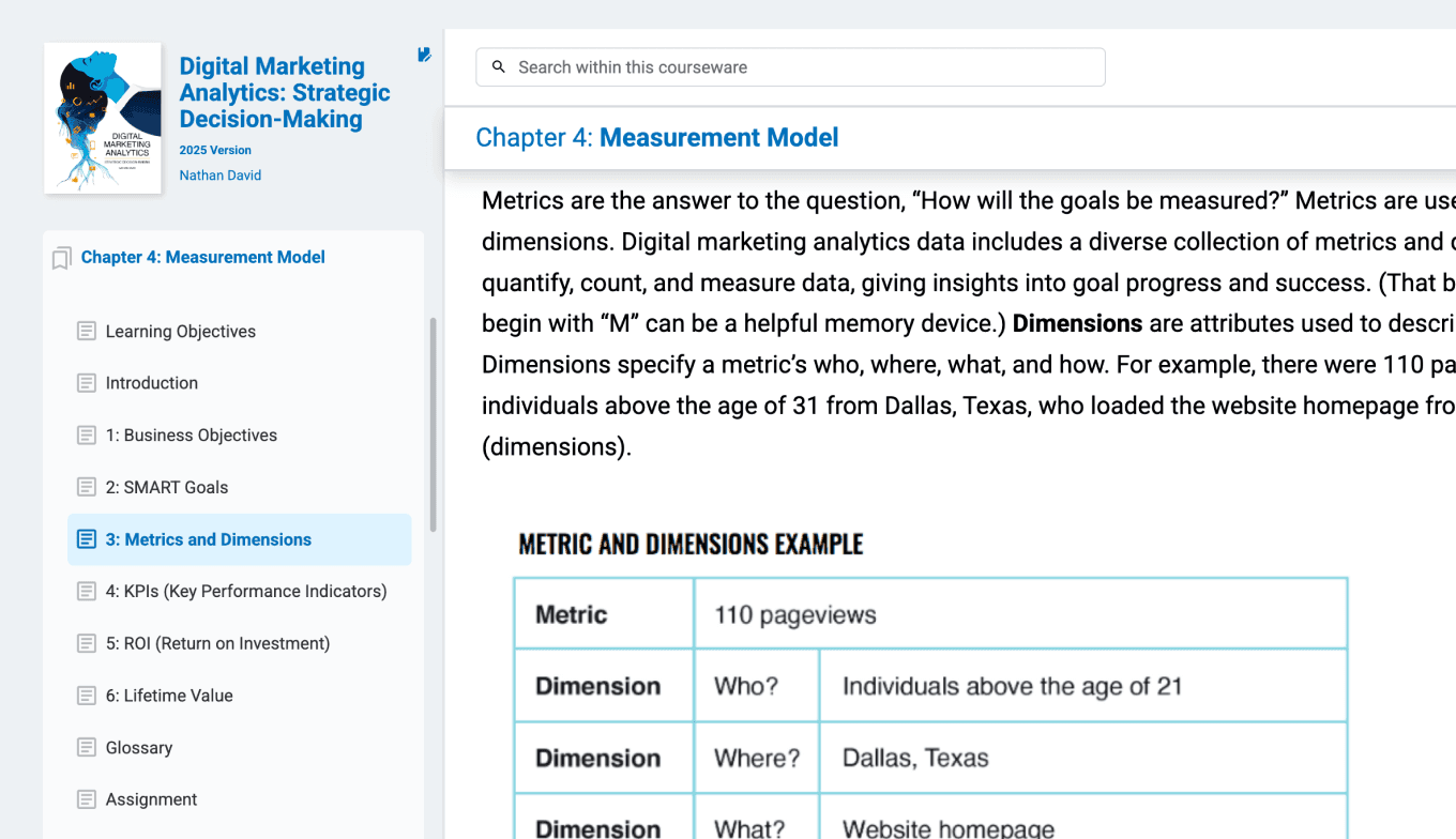 The “Digital Marketing Analytics: Strategic Decision-making” courseware introduces students to the strategy, tools, and decision-making frameworks used by modern marketers. Each chapter focuses on a key area of analytics — from SEO, paid media, GA4, to competitive research — and shows students how to evaluate performance and make smarter marketing decisions.