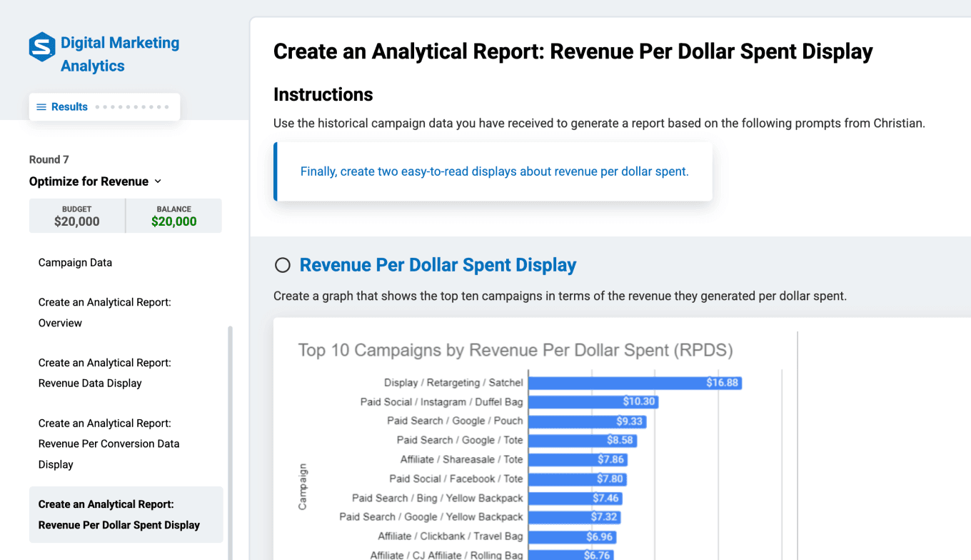 Each round challenges students to interpret data, optimize performance, and make informed real-world marketing decisions — just like a professional analyst.