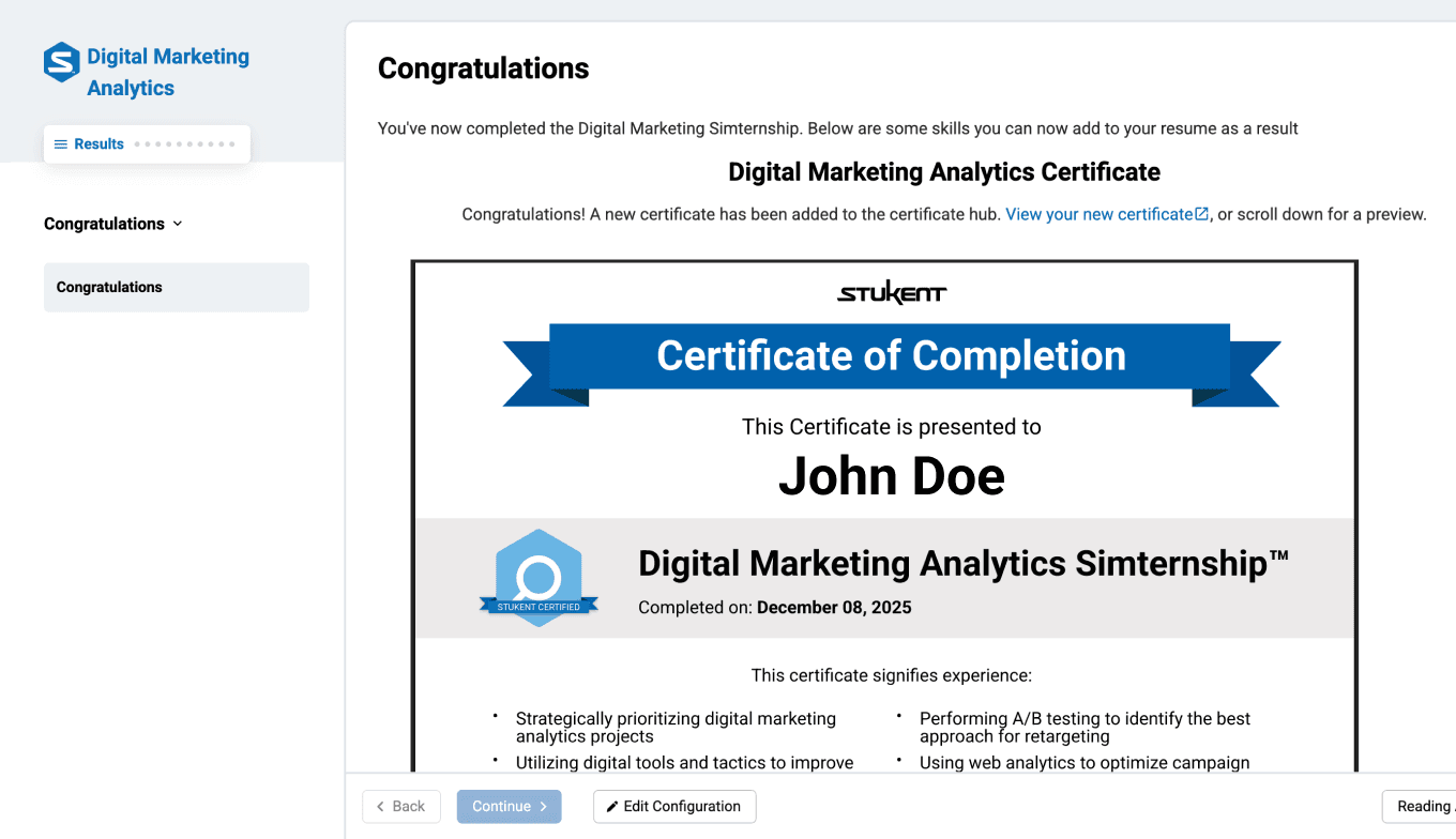 I'm thrilled to have honed my skills in strategically prioritizing digital marketing analytics projects from Stukent, utilizing digital tools and tactics to boost campaign performance, interpreting crucial metrics, and more. This experience has equipped me with the knowledge and tools to excel in the ever-evolving landscape of digital marketing.