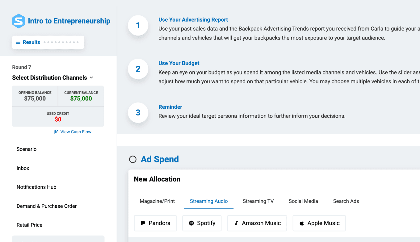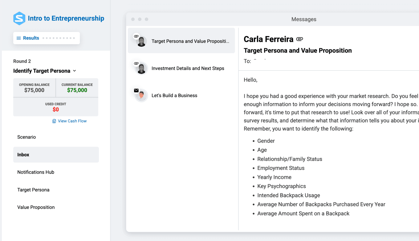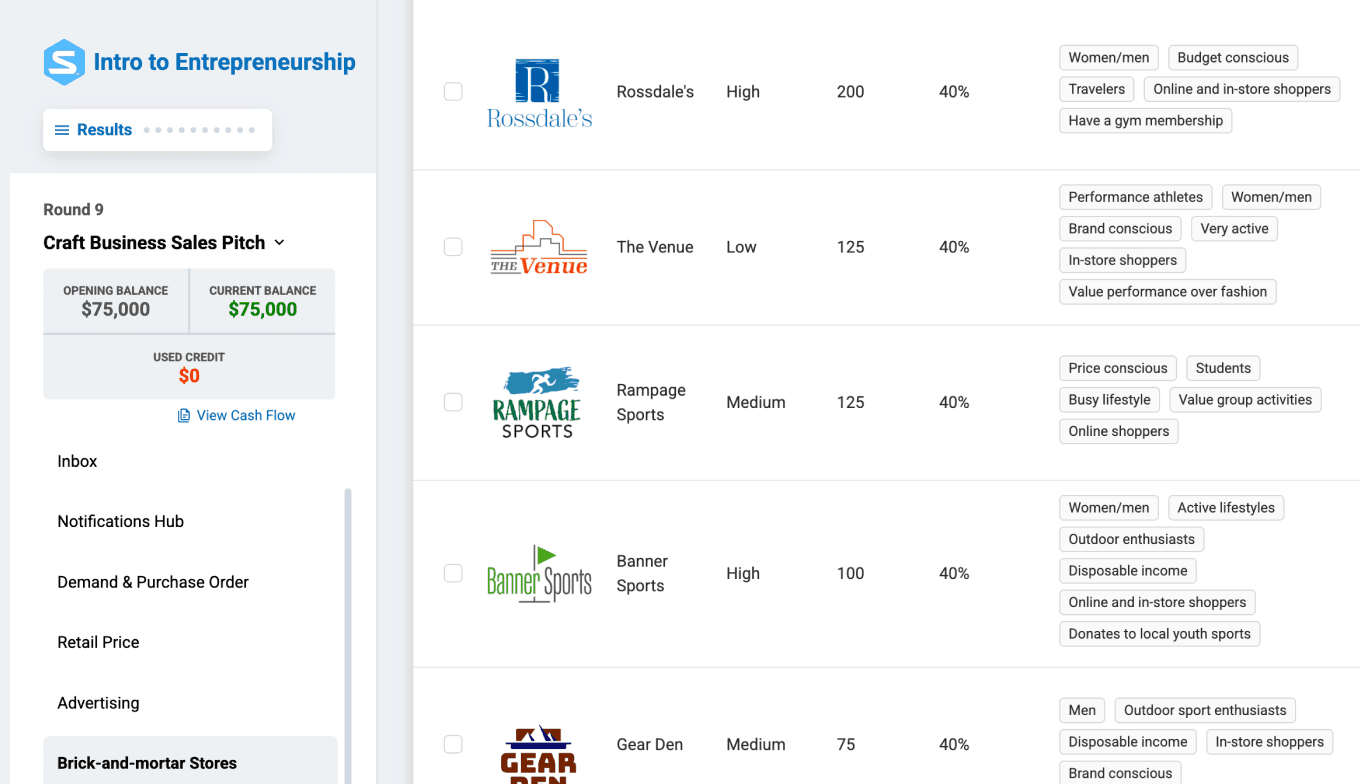 Give your students the opportunity to build, pitch, and grow a business without real-world risk. The Stukent® Entrepreneurship Simternship® allows your students to launch a simulated business in a low-risk environment. Over 10 interactive rounds, they'll make key business decisions, conduct market research, manage budgets, hire employees, and pitch to investors.