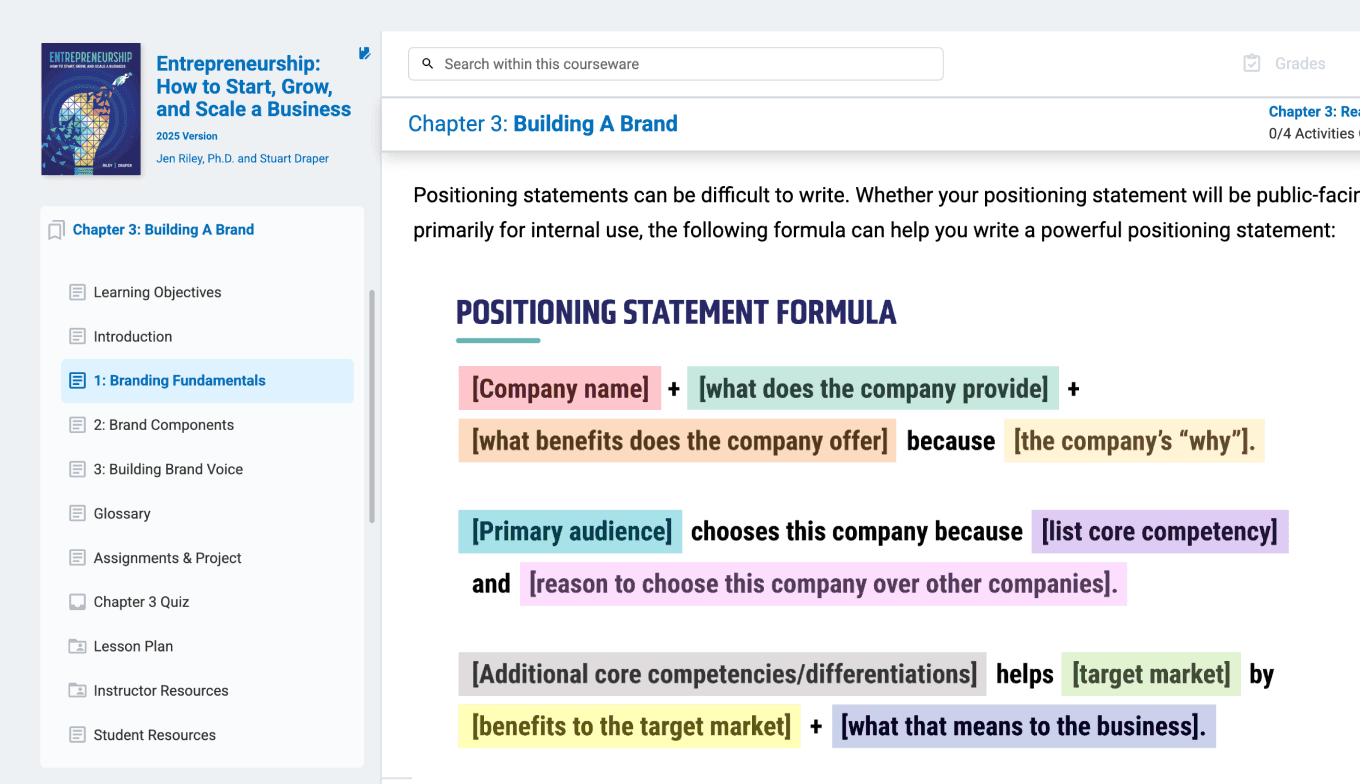 The “Entrepreneurship” courseware provides your students with a structured, step-by-step look at the entrepreneurial process. Each chapter introduces essential business concepts in a clear, accessible format, helping students build confidence as they move from idea to execution.