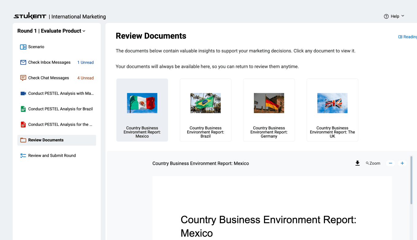 Give your students hands-on experience with global marketing strategy! The Stukent® International Marketing Simternship® places students in the role of a product marketing manager at a simulated company. Over eight rounds, they’ll research global markets, conduct a PESTEL analysis, select a country, develop a go-to-market strategy tailored to their audience, and so much more.