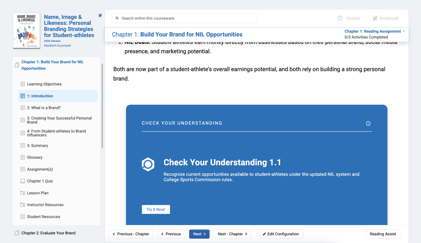 Updated annually with over 100 instructor resources, the “Name, Image & Likeness” courseware equips students with the business skills to manage clients' or personal brands. Through brand audits, NIL planning calendars, and certification assessments, each chapter transforms concepts into practical strategies athletes can implement immediately.