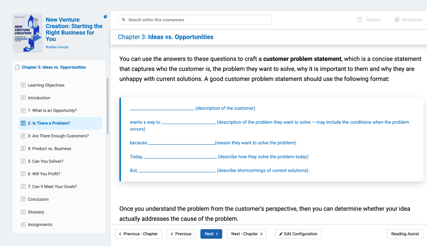 Prepare your students to succeed in today’s fast-moving entrepreneurial landscape with the “New Venture Creation” courseware. Students will move beyond the textbook and into the real world of business planning, including brainstorming methods, idea evaluation, revenue strategies, and beyond.