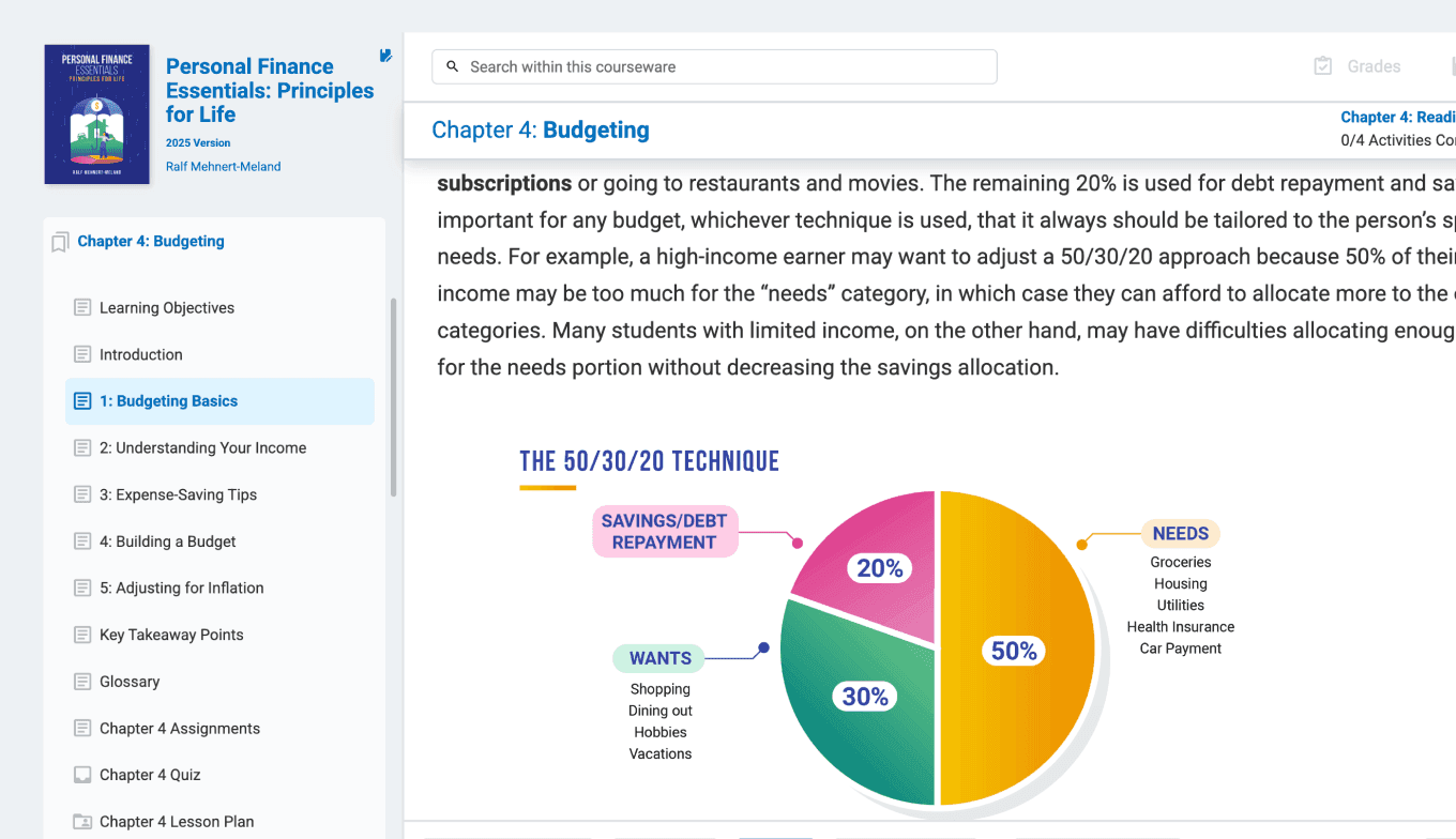 The “Personal Finance Essentials” courseware provides your students with a comprehensive foundation in money management, one chapter at a time. From budgeting and saving to credit, insurance, and investing, each lesson builds essential skills through practical, real-world application.