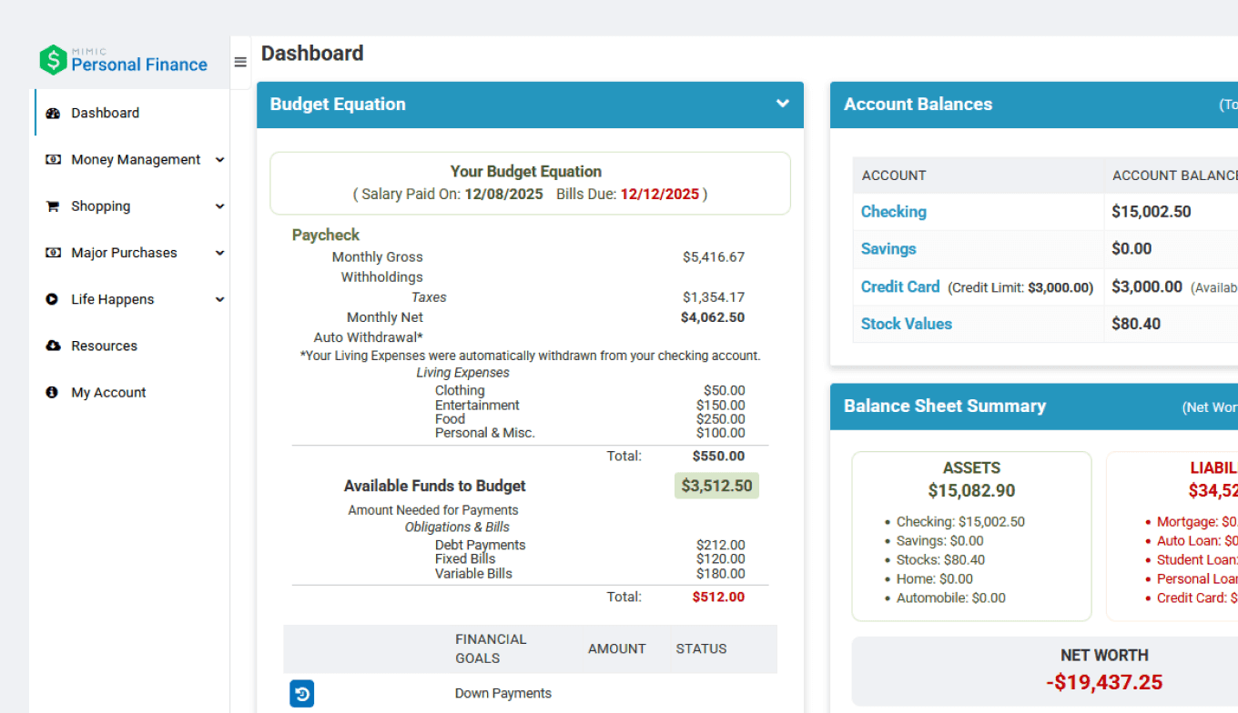 Each round challenges students to make realistic financial decisions, just like they would in real life. From creating budgets to managing surprise expenses, students apply core personal finance concepts in a hands-on, low-risk environment.