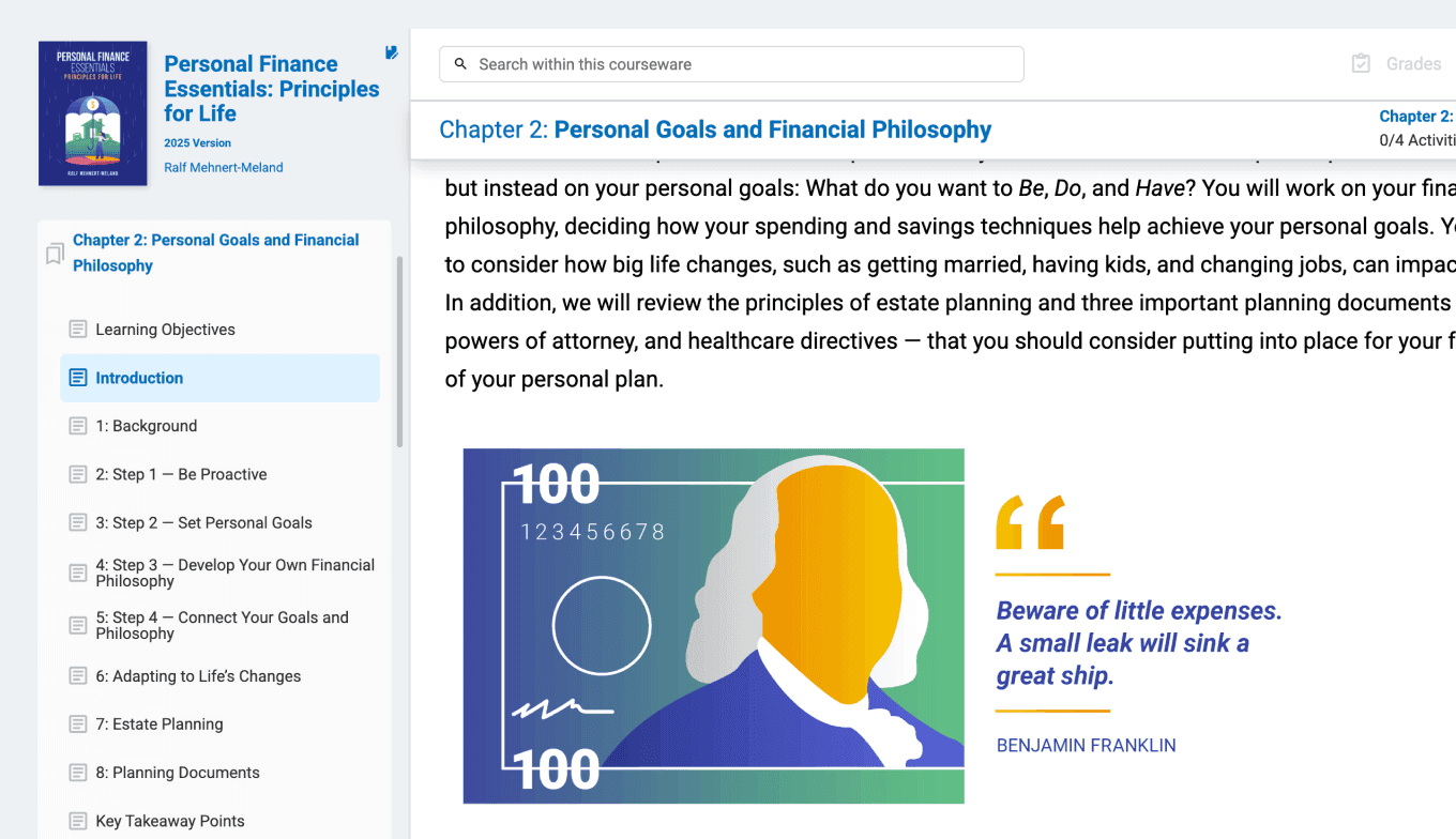 The “Personal Finance Essentials” courseware introduces students to the foundational skills necessary for managing money with confidence. Each chapter focuses on a key area of personal finance, including budgeting, saving, credit, banking, insurance, and investing, and provides students with practical strategies they can apply in everyday life.