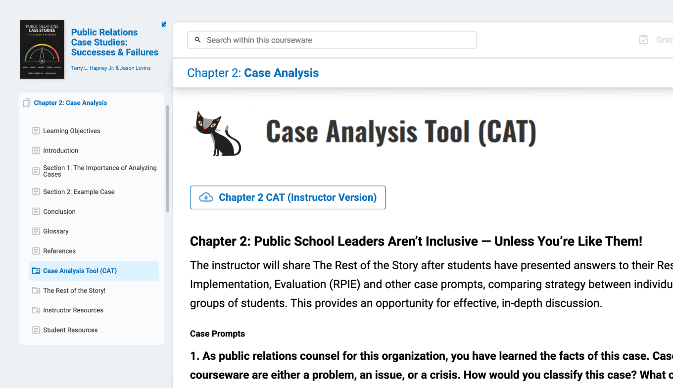 The “PR Case Studies” courseware equips you with 12 industry-relevant case studies designed to strengthen students’ strategic thinking and communication skills. Each case addresses a high-stakes PR scenario — ranging from product failures to funding crises — and gives students the structure they need to analyze, evaluate, and respond like professionals. Every case includes a narrative-driven scenario, a Case Analysis Tool (CAT) assignment, a live role-play prompt, and a “Rest of the Story” follow-up that connects classroom learning to real-world outcomes. It’s a turnkey solution for adding experiential, decision-based learning to your PR course.