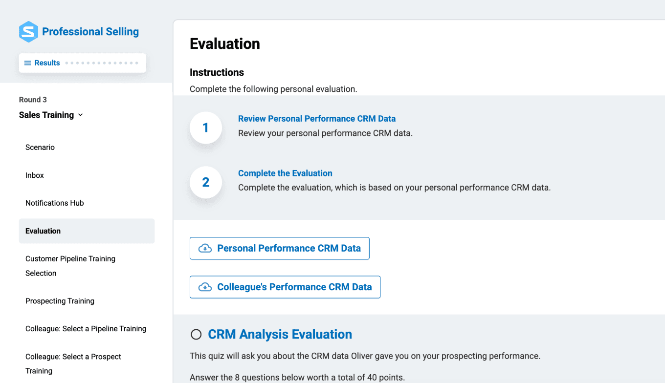 Each round challenges students to navigate realistic sales situations. From prospecting and planning to handling objections and closing deals, students apply essential selling skills in a hands-on, low-risk environment.
