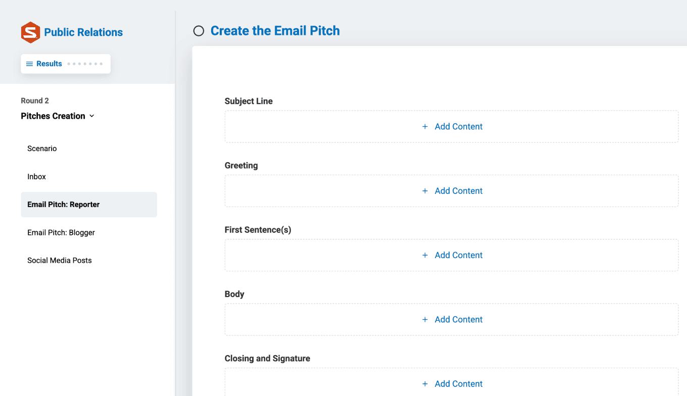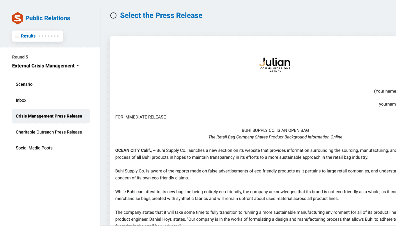 Every round replicates authentic PR situations. Students encounter obstacles, choose solutions, and receive immediate feedback. Take a look at how it works!