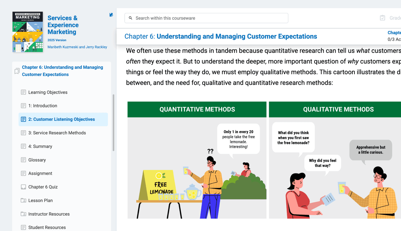 The "Services and Experience Marketing" courseware covers fundamental concepts, including service quality, customer expectations, and recovery strategies, to help your students develop essential service marketing expertise. Students develop a thorough understanding of what distinguishes services from products and how to apply these insights to drive marketing success.